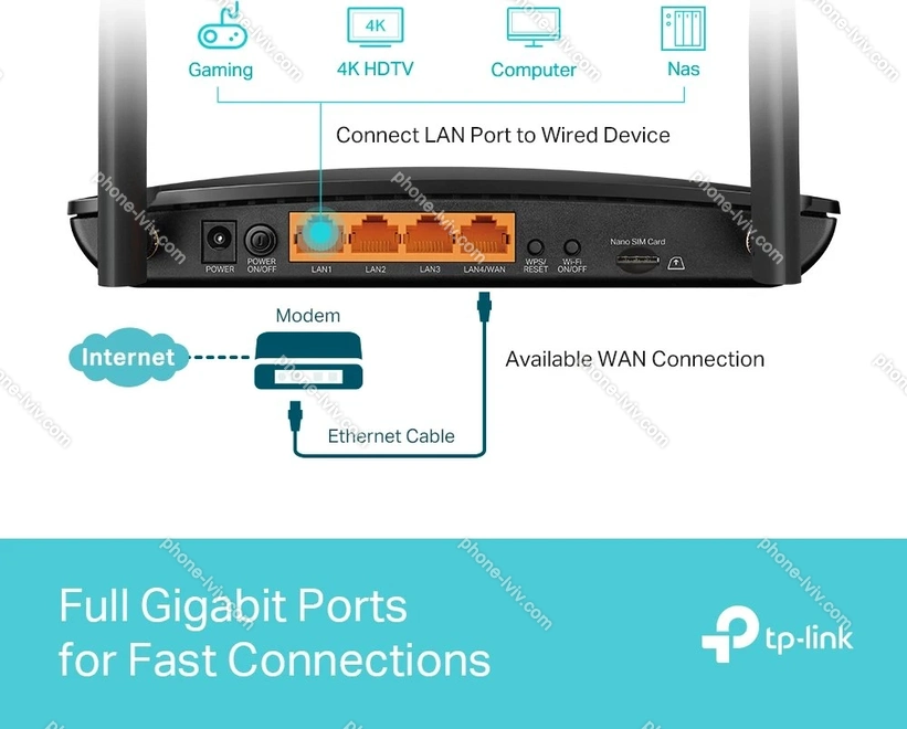 - Wi-Fi 5 (WLAN 802.11a/b/g/n/ac), 4x Gb LAN (1x спільний), 1x Gb WAN спільний