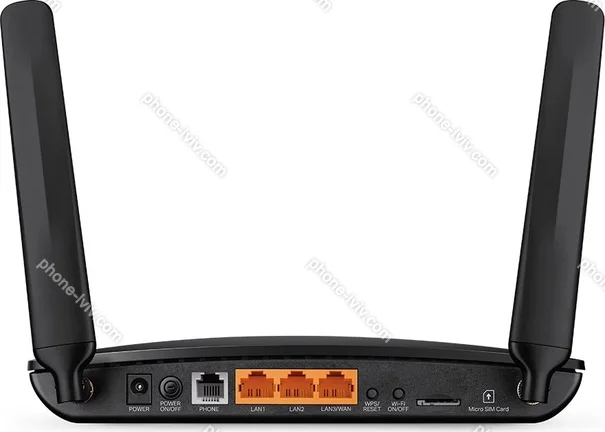 - 1x WAN (shared), 3x LAN (1x shared), Wi-Fi 4 (WLAN 802.11b/g/n), 1x Phone analog